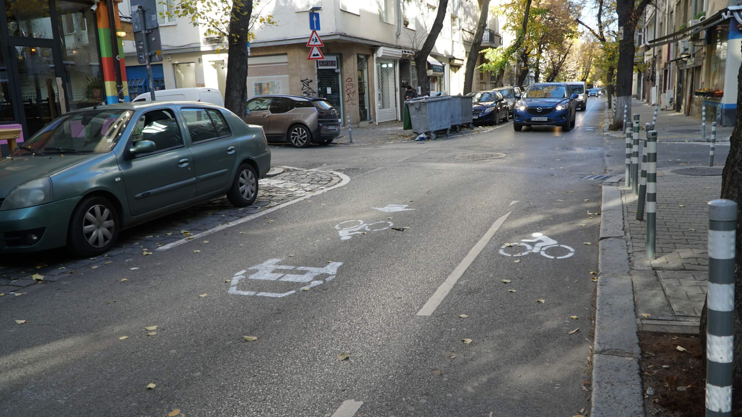 Сега тази лента вече е маркирана като контра-флоу, докато основното платно е обозначено за споделено между велосипеди и автомобили. Прави впечатление, че това е изпълнено според най-добрите практики в областта – с маркиране на посоката на движение и означаване на споделеното основно платно на основите кръстовища. Може би малко повече указателни пътни знаци също биха били от полза. Надяваме се това да регулира хаоса по тясната улица и приветстваме повече добри идеи за поощряване на незамърсяващите методи на придвижване в града.